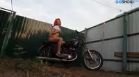 Sensual motorcycle goddess luring outdoors